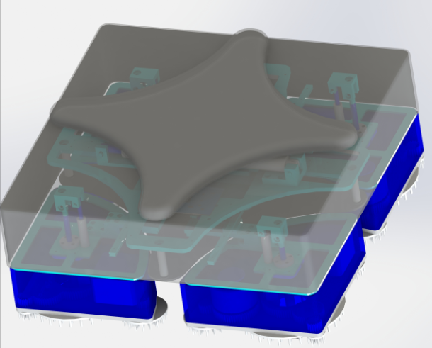 项目简介:现在,中国已成为世界上增长最迅速的工业机器人市场。尽管如此,中国现在的制造业机器人密度仍远低于发达国家,甚至不足世界平均水平的二分之一。劳动力成本上升、中国产业升级对高端装备的强劲需求将有助于工业机器人应用持续快速的开展。该成果综合了电子学、机械、自动控制、计算机软硬件、传感器、生物机械学、材料科学、模具、精密加工等多门学科。行走机器人的研究无疑对促进科技的开展和人类的进程有重大的现实意义,是当今科技的一种必然趋势,为机电产品的研究给予一种新的途径。特别是行走机器人技术的开展往往代表一个国家的科技实力和机电一体化的最新产品。从整体结构来看,机器人整体由顶盖、身体外壳、以及机器人的脚三大部分组成。当把机器人的顶盖拆开后,机器人的结构如图所示。内部主要有扩展模块、继电器、输入光耦模块、通讯模块和电动推杆等组成。整个机器人主要顺利获得内部结构的运动,来实现机器人的移动。从图3可以上看到整个机器人由上往下的一些身体组织。第一时间外部是一个四圆角星星顶盖,接着往下是导轨等一些内部零件。从图4可以很直观的看到机器人的身体内部结构和组成,以及四个角的设计。