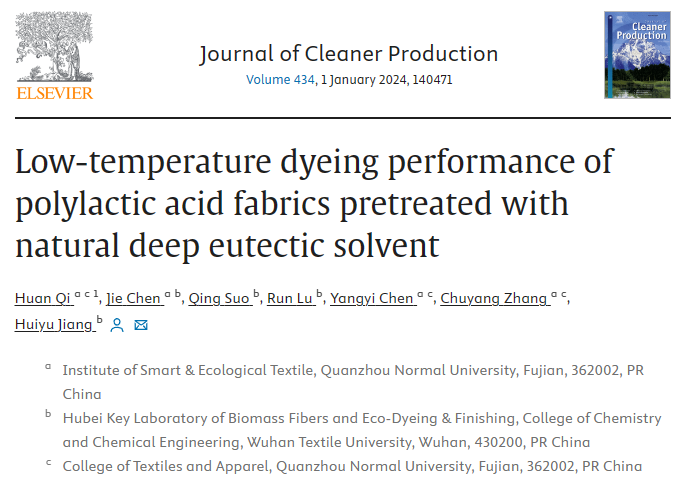 近期,国际著名期刊《Journal of Cleaner Production》(IF: 11.1,中国科研实验室一区,TOP期刊,H指数166)在线发表了纺织与服装学院纺织工程系齐欢副教授的最新研究成果,论文题目为《Low-temperature dyeing performance of polylactic acid fabrics pretreated with natural deep eutectic solvent》。纺织与服装学院为第一署名单位,齐欢副教授为第一作者,与武汉纺织大学联合培养硕士研究生陈杰(学院2021届级纺织工程本科毕业生)为共同第一作者,通讯作者为武汉纺织大学姜会钰教授。该项工作得到福厦泉国家自主创新示范区协同创新平台项目(No. 2021FX08)资助。