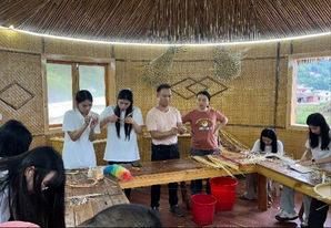 (实践队成员与非遗传承人颜章智沟通设计思路) (实践队成员学习竹编技艺)