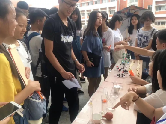 门厅的另一边同样围着很多新生,他们在参加迎新互动游戏,作为化工人,我们的游戏当然也要体系学院的专业特色,走近现场,会观看到学长学姐们给新生们两种考验,一个是看实验仪器说出仪器名称,一个是看化学模型选出对应的化学式,考考你的高中水平,毕竟过了一个暑假,还是难倒一批小伙伴,没关系,只要参与就能取得一支可爱的萝卜笔,当然,要是过关了,就能取得学院特制的钥匙扣。