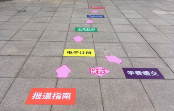 当新生沿着广场路线走近报到区,会在地面上看到色彩鲜艳的报道指南,五个步骤简明扼要,简单易懂,又有专门的学生干部在引导,也加快了注册速度。走到这里的时候,新生们就会在学生干部的指引下到背景墙跟家人或同学合影,现场氛围十分浓厚,这是大学的一张照片,记录着自己开始新生活的一刻,同学们都纷纷留影。