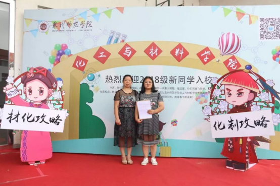 迎新活动在邱季端实验楼广场举办。新生们顺着广场走到学院门厅,第一时间映入眼帘的是一个大型活动背景墙,背景墙设计有一个写着化工与材料学院的大门,门内散发出一道道光芒,周边还有各种化学模型化学仪器,代表着新生们将跨过一道新的门槛,进入一个全新的世界,当然,这个世界跟他们的专业息息相关,希望新生们在这里怀揣梦想,成就梦想。同时,背景墙两边站着两个超级可爱的卡通人物,分别写着化制攻略和材化攻略,形象是今年暑假特别火的宫斗剧《延禧攻略》的主角,剧中女主过五关斩六将,克服各种困难,逐渐成长为一个成熟稳重有知识有技能的人,也是学院对新生的期待。因为学院是大类招生,分为化工与制药类和材料与化学类两个大专业,所以取名化制攻略和材化攻略,也代表着对全体新生的期待与祝愿。