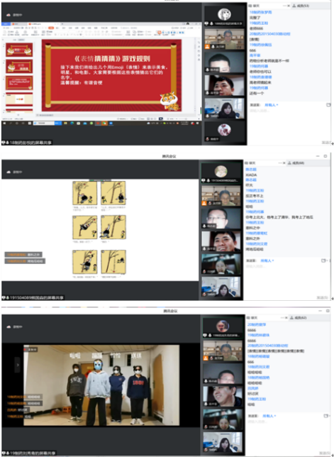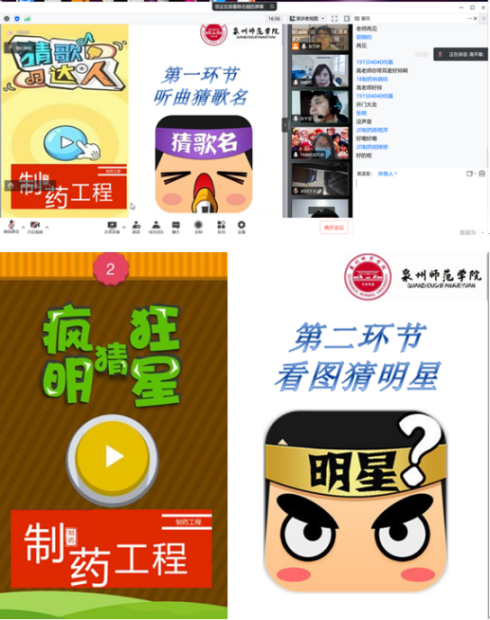 继第一次线上活动后,制药工程系的同学们表示线上活动非常有趣,很好地纾解大家在疫情控期间的烦闷心情。本周“互动会”以游戏环节拉开序幕,包括“听曲猜歌名”及“看图猜明星”两个内容。在才艺展示活动中,同学们表演了小品《父子故事》、舞蹈《小鸡恰恰舞》、小游戏《海龟汤》《表情猜猜猜》等丰富多彩的学生节目。活动尾声阶段,师生线上畅聊,老师们倾听着同学们现阶段的心绪,并从心理上给予他们更多的关切。