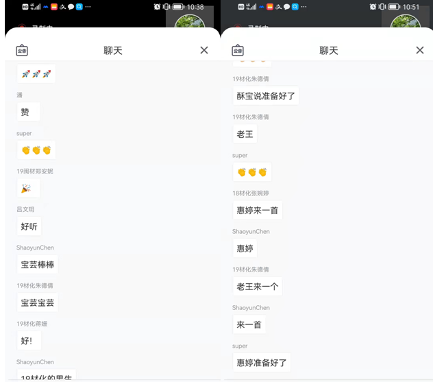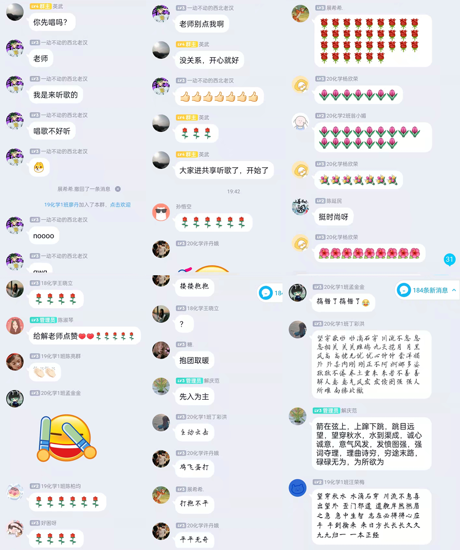 材料化学系老师在周末与同学们进行《全民K歌》活动。互动伊,大家都比较腼腆但随着几位同学的率先热场,大家的情绪被调动起来。系里的老师也参与其中,一展歌喉,进一步推高了线上气氛。同学们表示,遗憾的是时间过得比较快,不少同学来不及展示,两个小时的线上互动就结束了