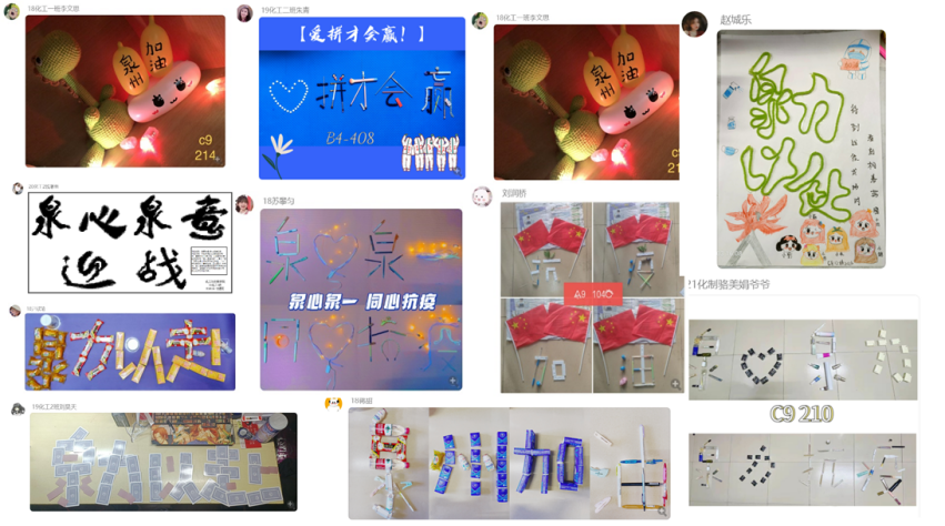 在“起抗疫”活动中,同学们以宿舍为单位,利用身边的物件进行艺术创作,以实物、图形摆放“抗疫口号”来表达抗疫的斗志与决心“爱拼才会赢”“泉力以赴”“泉心泉意等图形口号创意十足,彰显了同学们卓越的想象力与创造力。在“”赴的活动中,同学们顺利获得腾讯会议进行听音辩曲及才艺表演的活动。线上活动欢笑声喧,歌声婉转,驱散着阴霾,静待着夏天,祈愿疫情早日消除!
