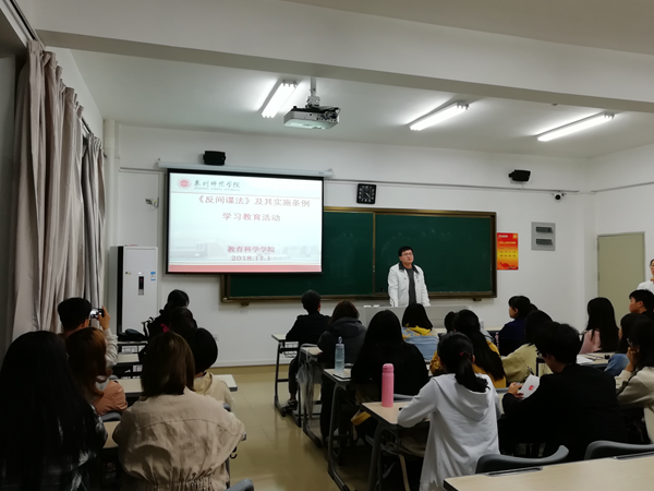 111日下午,教科学院在特教大楼A403教室组织召开《中华人民共和国反间谍法》及其实施条例学习教育活动。学院团委老师张甲玉2016、2017、2018级全体主要学生干部参加活动。