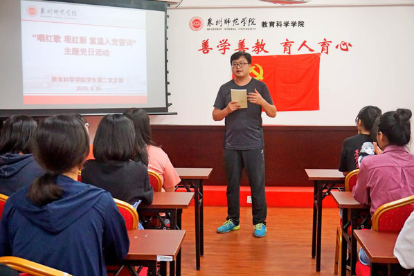 为庆祝新中国创建70周年,结合“不忘初心、牢记使命”主题教育要求,9月26日下午,教育科学学院学生第二团支部在特教大楼A601会议室召开“唱红歌,观红影,重温入党誓词”主题党日活动。支部书记张甲玉和支部全体党员参加。