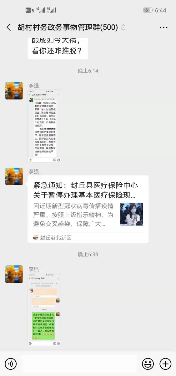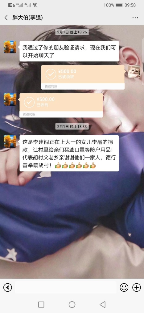 用心灵点燃希望的灯,用双手编织美丽彩虹,无穷的力量,有爱才能永恒。教育科学学院2019级应用心理学专业学生李晶,家住河南省新乡市封丘县胡村,从胡村团支部村委会在微信群中发起抗击疫情的捐款捐物活动中得知村卫生所口罩紧缺时,和家人一起自发捐献500元给村里买口罩等物资,带头为爱发声,其德行善举得到了村民的认可和赞扬,既温暖胡村,也温暖了全世界。