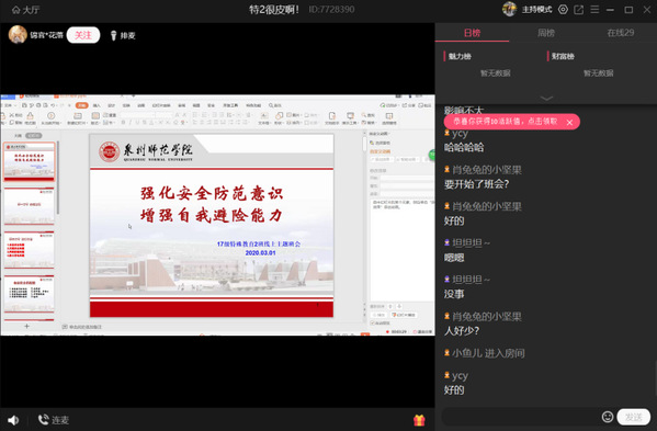 本次班会以线上直播、研讨互动为主,结合易班应用平台,传播安全知识,顺利获得集体安全知识学习、安全事例分享、规避安全风险三个环节召开活动。