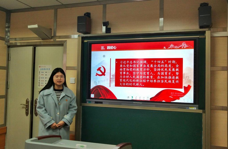 杨静以“牢记教育初心 做新时代教科人”为题,结合我院专业特色,告诉了我们应当立初心、守初心、践初心、担使命,担负起为党和人民培养社会主义建设者和接班人的使命。