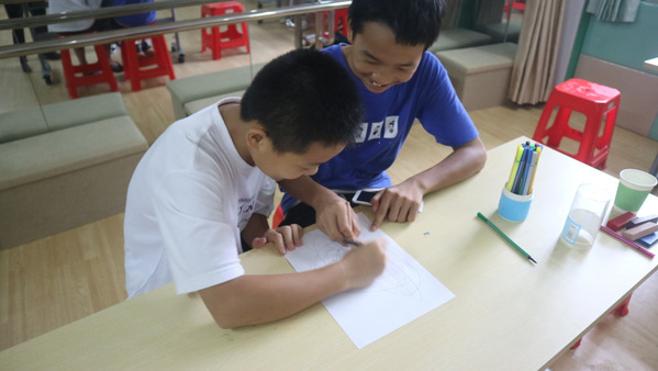 第一个环节是 “警察抓小偷”。学员2人一组,一个扮演警察,一个扮演小偷,在纸上勾画,你追我赶,然后在每张纸里寻找图案。顺利获得自由的线条勾勒,学员体验到简笔绘画的乐趣,促进了合作分享的能力。第二个环节是“我画我自信”。三位泉州师院2019级应用心理学专业大学生分别带领3个小组的学员,以花木兰替父从军回家的场景为片段,引导学员研讨花木兰家人关系,然后创作出《花木兰》情景剧简笔画。第三个环节是“你猜我说”。各组成员分享绘画成果,其他小组成员根据“这个作品反映了花木兰和家人之间的什么关系?”的问题进行猜测研讨。指导老师引导学员叙述绘画作品背后的家人故事,梳理家人冲突的脉络。第四个环节是“父亲节的礼物”。大学生和学员在各自挑选的彩色卡纸上写下最想跟父亲说的一句话。学员写下四期活动收获和建议。活动结束后,泉州师院教科院教工第一团支部指导老师许松芽副教授、石狮近邻许志上主任与大学生志愿者召开活动总结研讨。