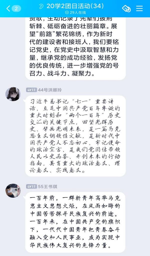 此次党史学习线上团日活动,最后在学生们持续踊跃的心得分享中步入尾声。本次团日活动,为我们新时代中国青年给予了更为直接、更为有效的机会,让我们学会感恩生于和平年代,感激成长于百年历史机遇碰撞之际,激励自己迎合新时代新格局更需加倍付出奋斗朝气。顺利获得学习贯彻习近平总书记在庆祝中国共产党创建100周年大会上和“七一章”颁投仪式上的重要讲话精神,紧跟上“学党史,强信念,跟党走”学习教育,青年一代思想意识形态必将得到进一步夯实与升华,为新时代新格局中华民族伟大复兴的中国梦实现挥舞思想旗帜。
