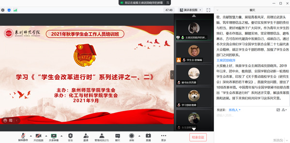 为深入学习贯彻习近平总书记在党史学习教育动员大会上的重要讲话精神,落实“学党史,强信念,跟党走”的学习教育活动,教育科学学院2021年8月中下旬至9月底顺利获得线上学习的方式召开以“请党放心,强国有我”为主题的秋季学生会工作人员培训班,教育科学学院全体学生会干部参与此次培训。