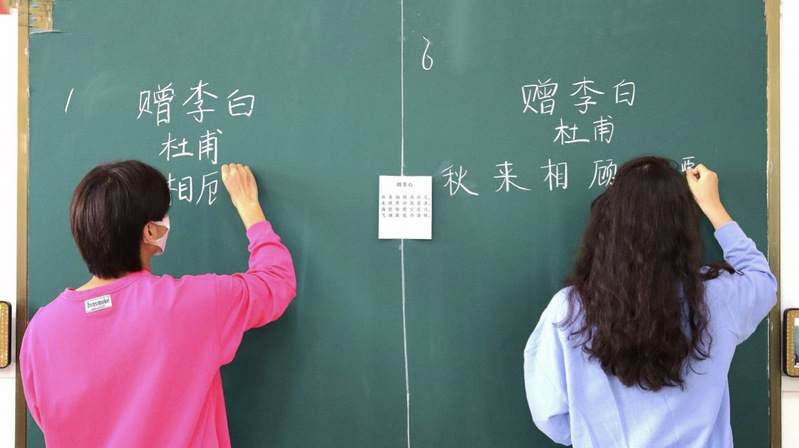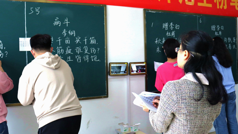 本次比赛以小组为单位进行,六人为一组,评委老师根据书写字体、笔画顺序、版面整洁等要点进行评分。比赛开始,参赛选手全神贯注于书写过程中,努力把握一笔一划的书写力道,凝神聚气、认真专注地完成古诗书写。随着时间的流逝,比赛接近尾声,参赛选手用精湛的书写技能呈现了一场精彩的粉笔字比拼盛宴,所书写的粉笔字笔风各具特色,有的遒劲刚毅,有的飘逸舒展,其运笔与结构都形神俱佳。整个比赛场面紧张、有序,氛围浓厚。