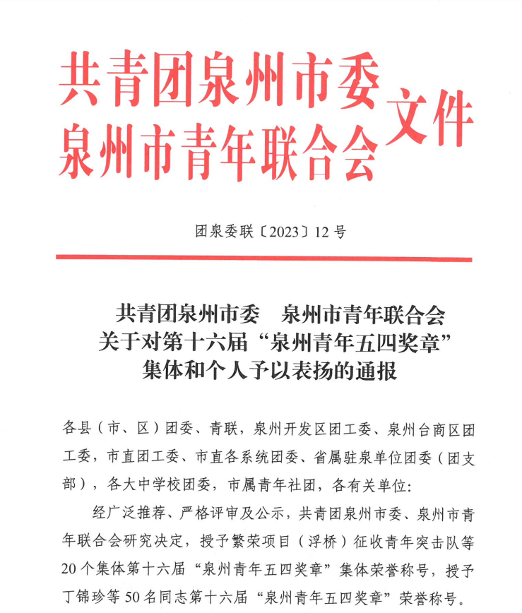 五四青年节来临之际,共青团泉州市委、泉州市青年联合会共同颁授第十六届“泉州市青年五四奖章”,表彰青年中的优秀典型和模范代表。授予丁锦珍等50名同志第十六届“泉州青年五四奖章”荣誉称号。其中,我院院长雷培梁荣获第十六届“泉州市青年五四奖章”荣誉称号。