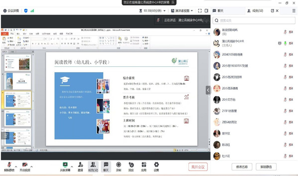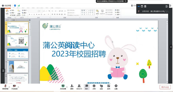 为促进毕业生高质量就业,深化校企研讨合作。112日晚上七点,蒲公英儿童阅读中心面向教育科学学院毕业生进行了一场线上的校园招聘宣讲会,2020级小学教育专业、学前教育专业、特殊教育专业学生参与此次活动。