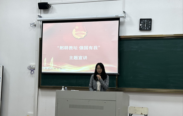 团委委员林霖以“躬耕教坛,强国有我”为主题,教育引导学生深入学习习近平总书记致全国优秀教师代表的信,勉励青年学子们努力成为党和人民满意的“四有”好老师。