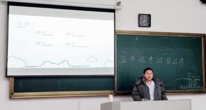 此次班会从多角度对我院学生进行教育和引导,从而明确学习目标,合理规划复习时间,端正考试态度,自觉遵规守纪,把诚信思想内化于心,外化于行。
