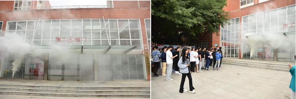 演练模拟场景为理工教学楼一楼金工车间内着火,消防控制室值班人员发现火情后,立即进行上报,启动消防应急疏散预案,同时迅速拨打“119”报警。指挥组、灭火组、疏散组、救护组等成员按照职责分工,迅速切断非消防电源、启动消防泵、疏散楼内师生等。师生快速有序撤离至理工楼5号门前广场并集合点名,确保无人滞留火场。