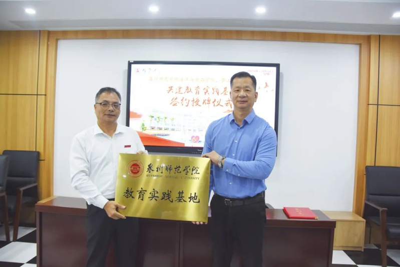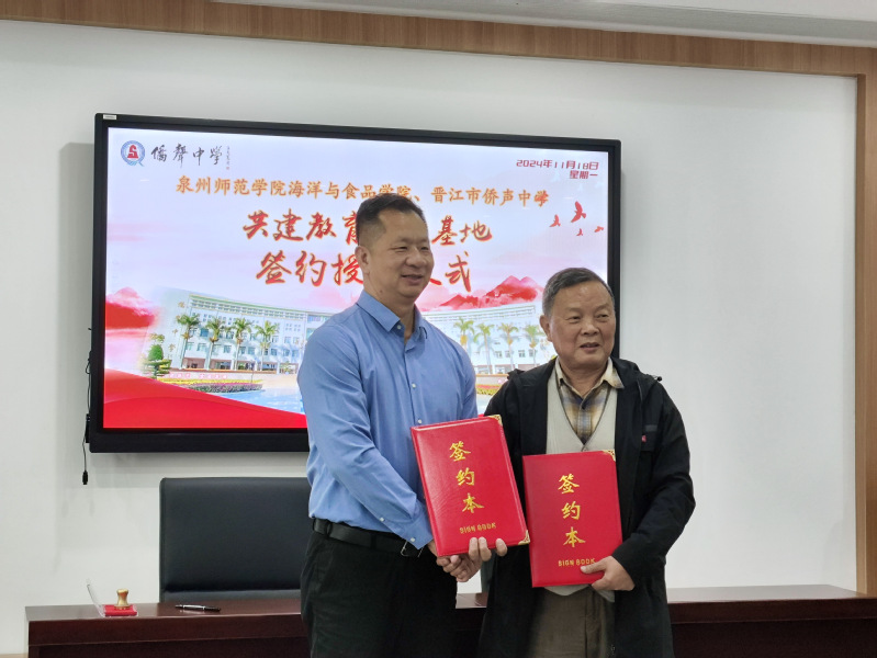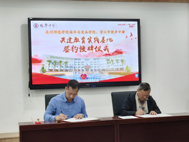 1118日,海洋与食品学院与晋江市侨声中学共建教育实践基地签约授牌仪式在晋江市侨声中学举行。仪式由侨声中学教务处主任周明阳主持。参加仪式的有海洋与食品学院院长袁建军、党委书记蔡志荣、党政办公室主任洪钦赐,生物科学系主任陈细香、副主任王艺璇,侨声中学党委书记兼校长吴健康、教务处主任周明阳、副主任张劲松、蔡阿园、俞建明、主任助理陈秀盆以及生物组教师。