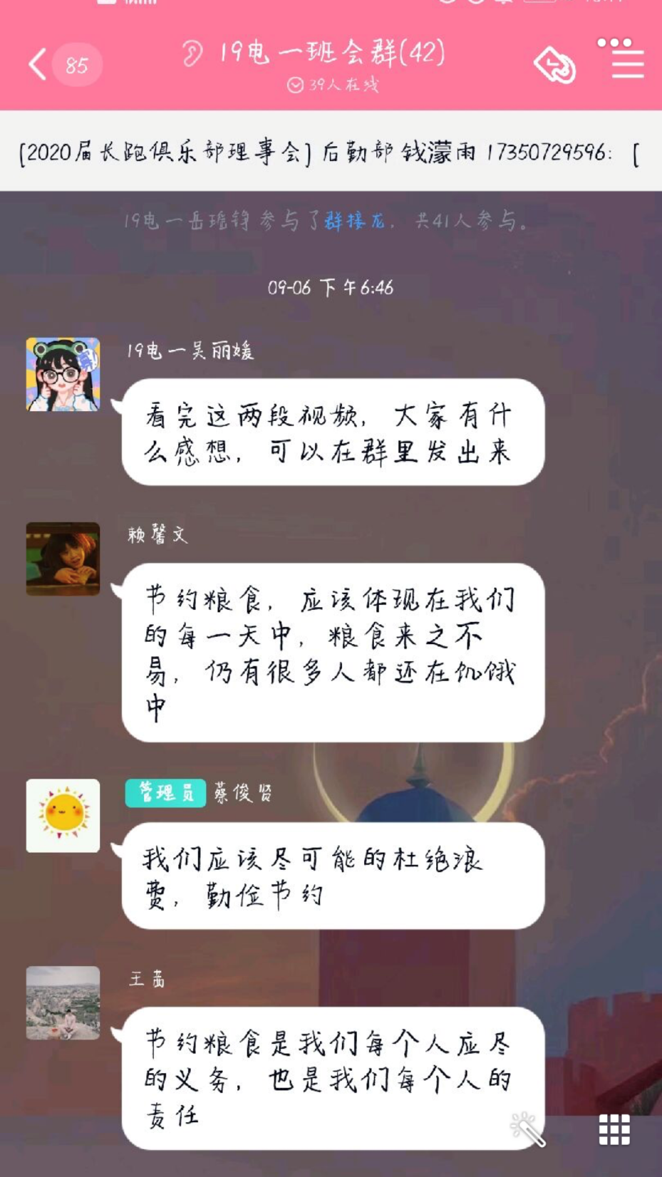 2019级市场营销专业同学对“如何进行光盘行动”展开讨论,让学生切实思考如何更好地进行光盘行动;2019级经济学同学顺利获得分享视频讲解,提高了同学们对“节约粮食”的认识。
