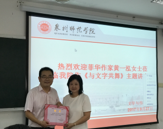 2017年9月27日下午四时,泉籍菲华作家黄一泓女士莅临我院并作《与文字共舞》主题讲座。中文系主任古大勇教授、现当代文学郑丽霞博士出席讲座,15级中文系全体同学参加。