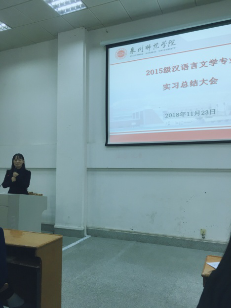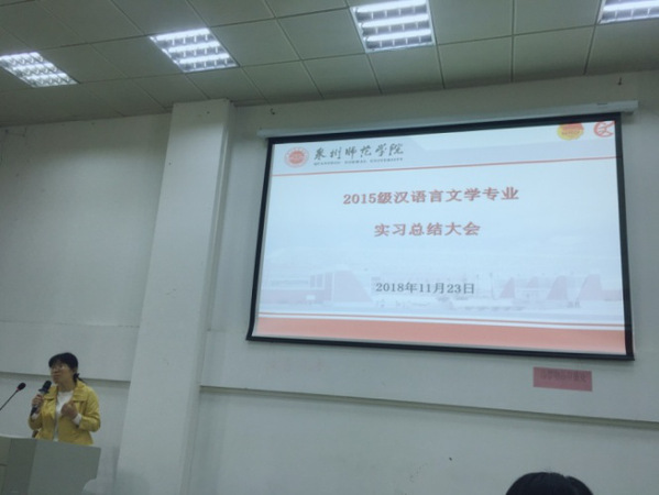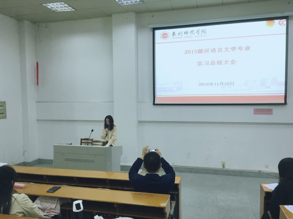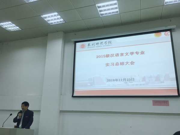 20181123日, 我院召开2015级汉语言文学专业实习总结大会活动顺利召开。会议由我院中文系主任古大勇教授主持, 杨秋生副院长、郑小雅老师、郑亚芳老师、2015级各实习队成员、2016级中文全体学生参加,