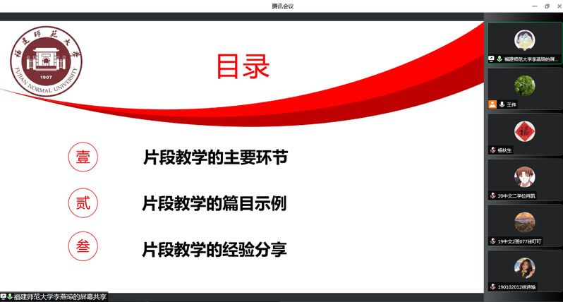 为了更好地推进2022届师范生教育教学能力(高级中学语文)的考核工作,文传学院学科语文教学团队运用腾讯会议系统,在4月16日晚上在线举办“教学片段试讲与答辩”分享活动(“2022届师范生教育教学能力考核说明活动第二场”)。本次活动作为第一场活动(“语文学科知识与教学能力”)的延续,邀请福建师范大学文学院学科教学(语文)方向研究生李燕琼主讲,主要聚焦于片段教学的实际操作与反思。文传学院分管教学副院长杨秋生,中文系主任王伟、副主任李莉,汉教系主任王曦,学科语文教学团队骨干成员,以及在学研究生、文传学院与外国语学院的部分师范生参加本次活动。