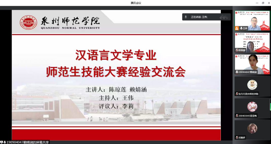 为了更好地有助于“‘课岗赛证’融通一体,打造环湾语文名师新高地”的专业人才培养目标,文传学院中文系于820日顺利获得腾讯会议系统,线上举办“冲刺‘国赛’:师范生技能大赛经验研讨暨动员活动”,中文系主任王伟,分管实习实训工作的副主任李莉,学科教学语文团队骨干教师陈琼莲、张丹丹,汉语言文学专业高年级同学参加本次会议。