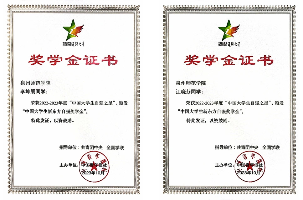 日前,由共青团中央、全国学联指导,中国青年报、新东方教育科技集团、中国青年创业就业基金会联合举办的2022-2023年度“中国大学生自强之星”奖学金推报评选活动顺利结束。文学与传播学院2020级美术学(书法)专业研究生李坤朋、2020级汉语国际教育专业本科生江晓芬两位同学凭借出色的能力和优秀的履历,成功获此殊荣。