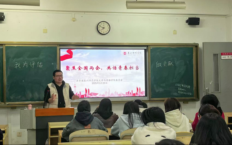 为学习宣传贯彻习近平总书记在全国两会期间的重要讲话精神和全国两会精神,引导广大团员和青年深刻把握全国两会精神的核心要义和战略部署,紧跟时政热点,凝聚青春共识。文传学院辅导员于3月19-25日在各班级召开“聚焦全国两会,共话青春担当”主题班会。