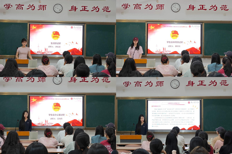 会议第一项议程中,主席团成员与六位部门负责人依次进行述职汇报。各位学生骨干结合工作实际,顺利获得具体案例与数据,从工作实效、创新举措、团队协作、作风建设等方面进行了全面汇报,既展示了阶段性成果,又诚恳剖析了存在的问题与不足,并提出了下一阶段的改进方向与具体措施。现场气氛严肃认真,展现了学生干部务实反思、持续进取的精神风貌。
