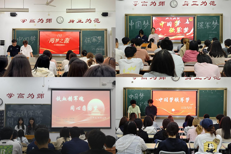 活动中,各班顺利获得PPT展示、知识讲解等环节,帮助同学们学习相关知识。其中,25书法班以清晰的PPT呈现,讲解“中国梦”与“强军梦”的联系;25中文1班围绕“军魂”与“国家”二者之间密不可分的关系,以故事讲解开场,有力呈现了“兵强则国安”的重要性;25中文2班从自身专业出发,阐述青年在实现“两梦”中的责任;25汉教班则顺利获得“两梦之源”等板块,呼吁同学们将强军精神转化为学习、生活中的动力。
