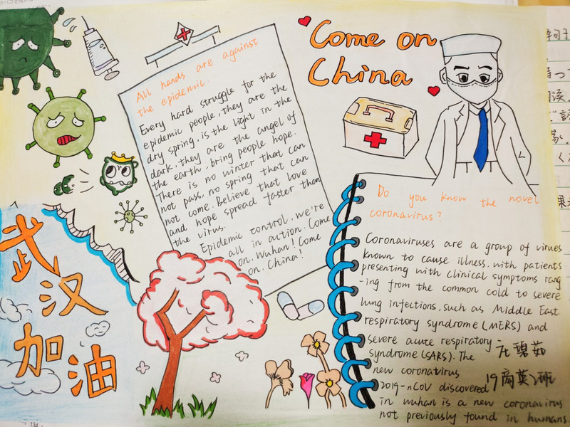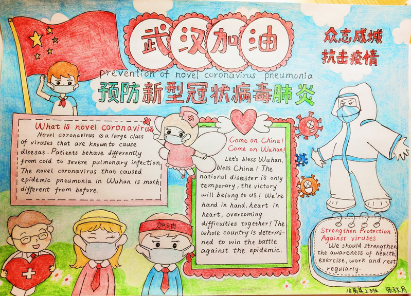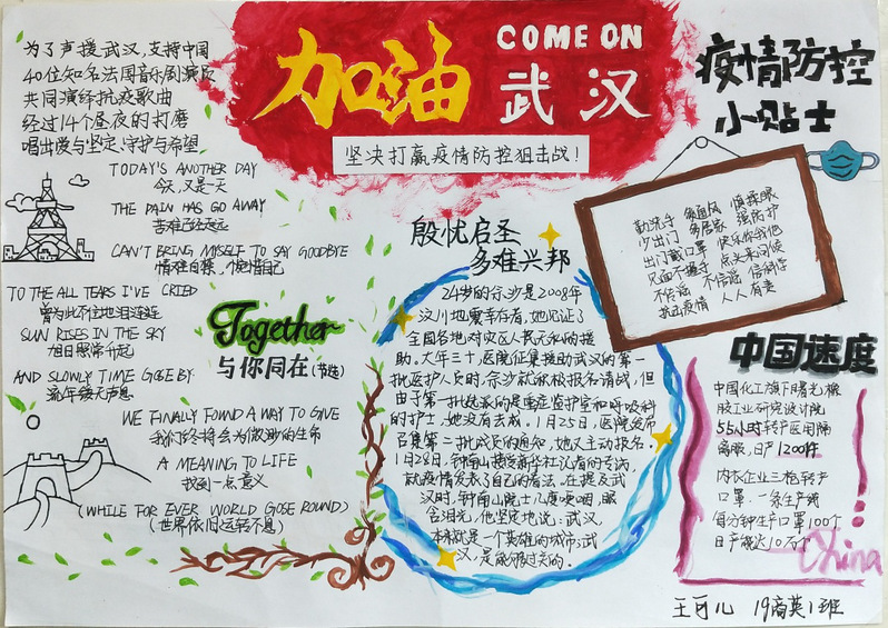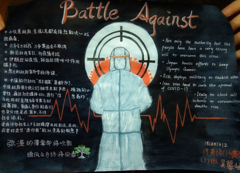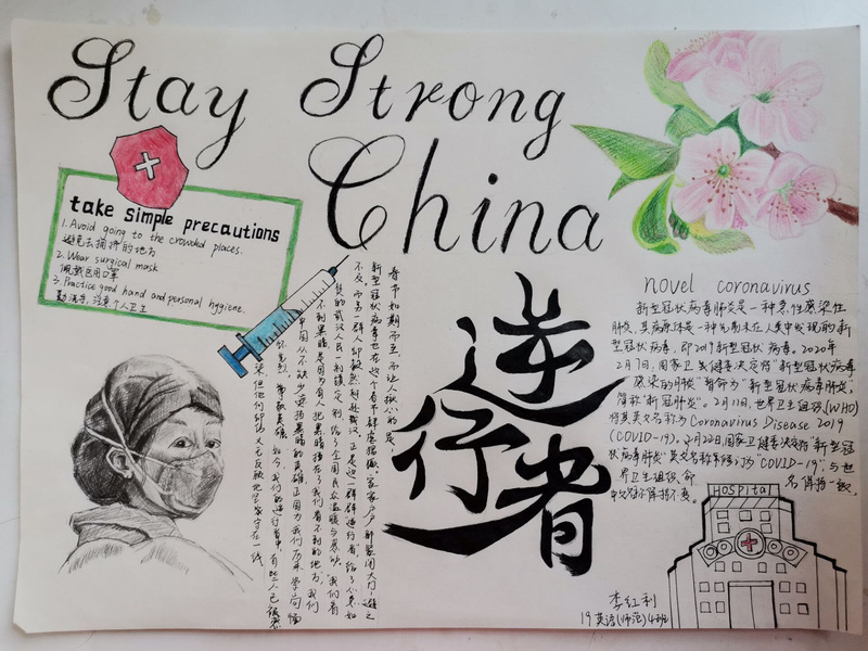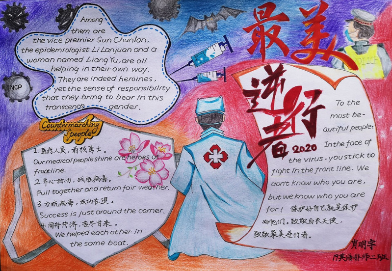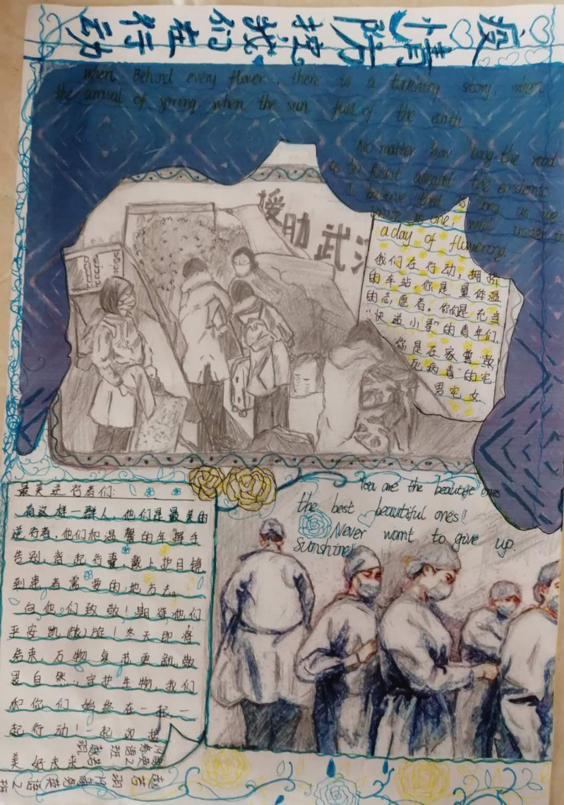 我们会因为疫情而感到踌躇,但不会停下生活的脚步。奋战在前线的医护人员的种种事迹,使得同学们感慨万分,纷纷动手画下了有意义的手抄报,并踊跃地投递出自己的作品。不一样的风格体现了不一样的内涵,展现了不一样的美。在手抄报中,有的同学为了给武汉加油鼓劲,画下了生动的人物形象。有的同学用自己最真诚的话语,表达了对“最美逆行者们致敬;有的同学身体力行,为我们科普了许多防控疫情的方法······如此种种,皆表现出同学对2020年重新焕发蓬勃生机的美好祝愿。