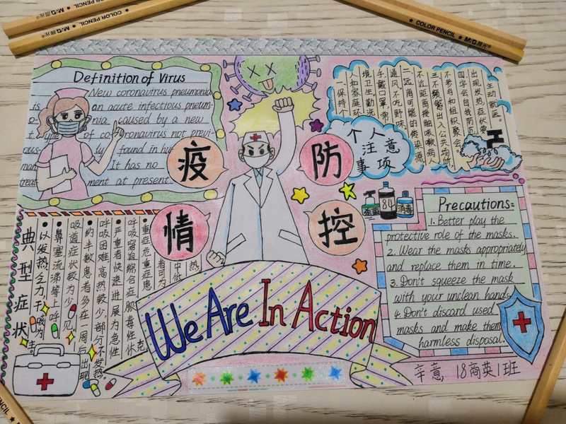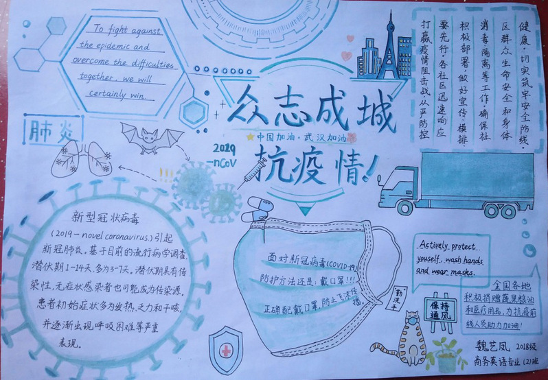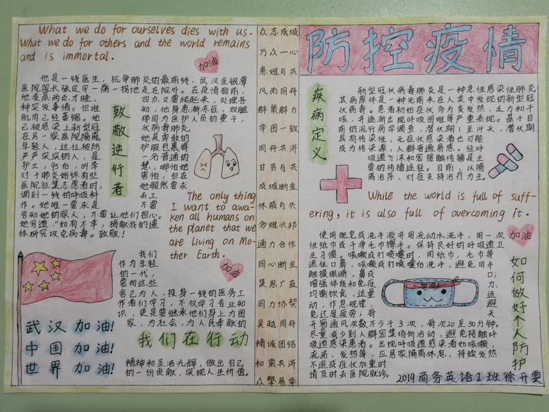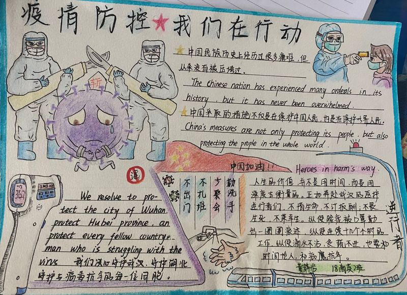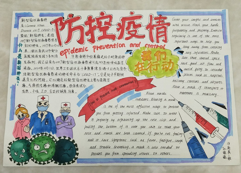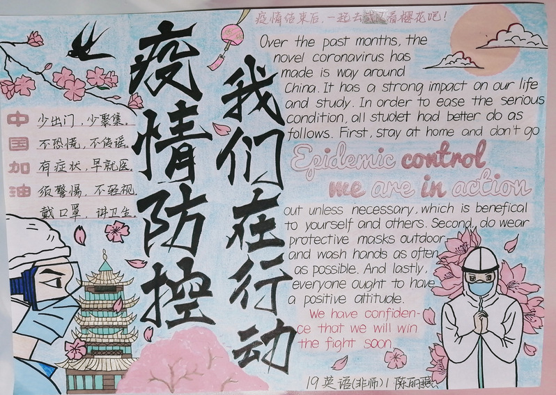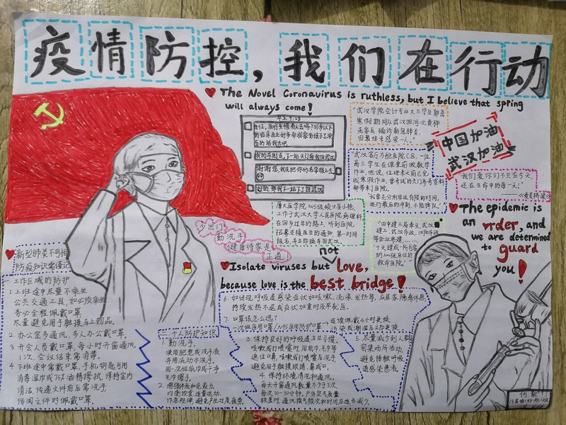 疫情形势严峻,但我们相信,没有一个冬天不可逾越,没有一个春天不会到来。为了响应国家持续防疫的号召,311日至321日,外国语学院举办了一场线上“防控疫情,我们在行动主题双语手抄报活动,我院的同学们持续地参加了此次活动。