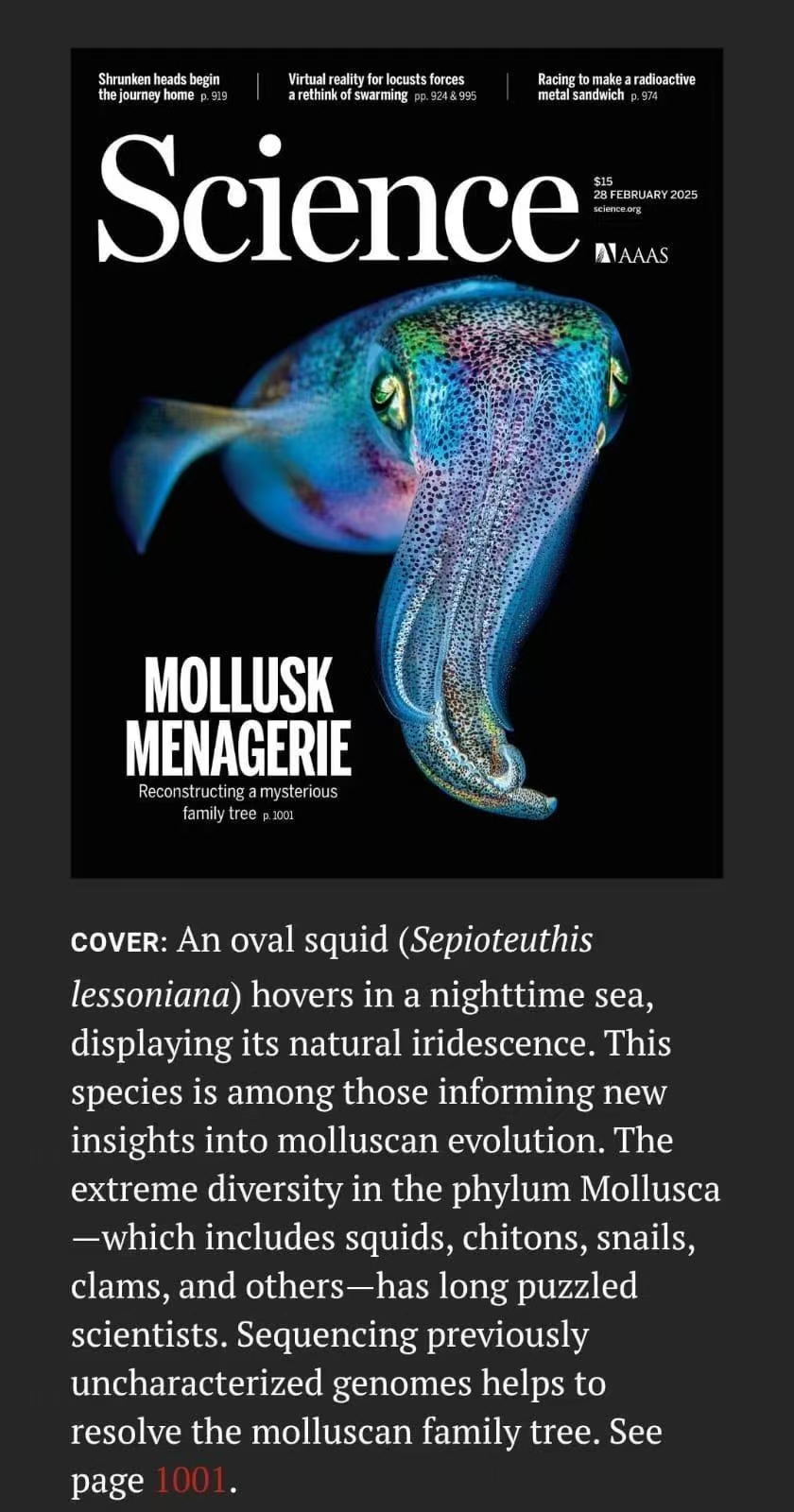 2025年2月27日,陈泽源以第一作者身份在国际顶级期刊《Science》发表封面文章 “A genome-based phylogeny for Mollusca is concordant with fossils and morphology”,通讯作者为Julia Sigwart教授。该研究首次在基因组水平整合软体动物八大纲,新增13个关键软体动物物种的基因组数据,并首次发布了两个较为完整的单板纲基因组。