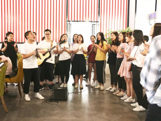 歌唱献礼的温馨延续到了午间食堂,音舞学院的学子们在特教大楼教职工食堂给老师们送上惊喜又精彩的快闪表演!当老师们在用餐时,50几名音舞学生出现在食堂,他们拿着手铃、吉他齐声唱着《那些花儿》、《稻香》、《蓝蓝的夜蓝蓝的梦》三首歌曲,歌声宛转悠扬,传达出他们对老师的祝福和感谢。