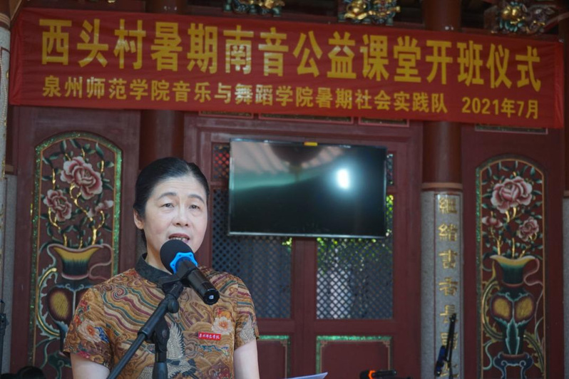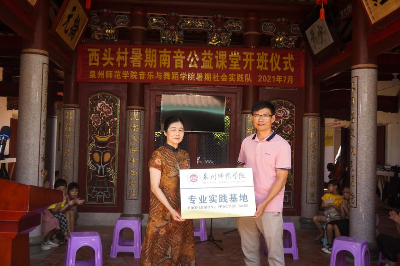 在7月13日的开班仪式上,原校党委副书记现泉州市教育基金会副理事长张舟、校团委书记刘显新、院党委书记苏国柱、南音系主任白志艺、惠安县关工委刘忠民主任、净峰镇党委组委吴泽祺等领导莅临关心指导,西头村团支部书记张钦强致欢迎辞,音乐与舞蹈学院院长王丹丹作讲话,并向西头村授予“泉州师院专业实践基地”。王丹丹院长嘱托实践队队员们顺利获得本次社会实践活动向西头村的南音前辈们虚心请教、认真学习,在实践中熏陶思想、提升品德、增长才干、将所学专业知识教授予新一代南音文化传习者,取得丰富的教学、实践经验,身体力行地传承世界非遗、中华优秀传统文化——南音,并创新性地推广南音,希望丰富多彩的公益课堂和公益宣传活动能助力西头村的文化建设、为新农村建设、乡村振兴增光添彩。