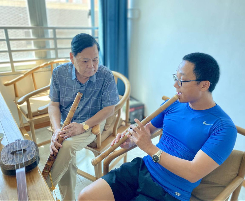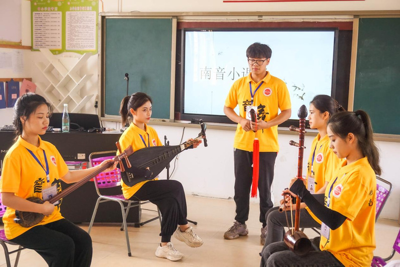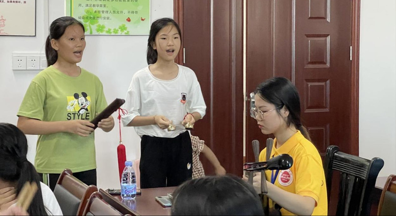 在面向近50名学员的为期一周的南音公益课堂中,实践队针对每位学员的学习基础,量身打造了理论课、声乐课、器乐课等课程,分为南琶班、二弦班、洞箫班、唱腔班四个小班进行教学,将孩子们的南音学习进一步系统化、科学化。南音系的研究生为小学员们生动地讲解了南音史论的部分知识,增加了孩子们对南音历史的分析;实践队以分组教学的形式带领孩子们细致学习南音中的工乂谱,队员们第一时间将“乂”“工”“六”“甲”“一”五个基本音以讲解加以琵琶伴奏的方式将工乂谱的看谱方式及唱法教给小学员们,后以《棉答絮》一谱进行唱谱训练,让小学员们感到十分新奇,纷纷表示又学到了南音的一项基础技能;小老师们手把手地教授学员们南音四宝、四管的演奏方式及每种乐器的演奏技巧,加深了孩子们对南音演奏乐器的分析,开拓了小学员们的眼界。