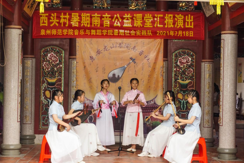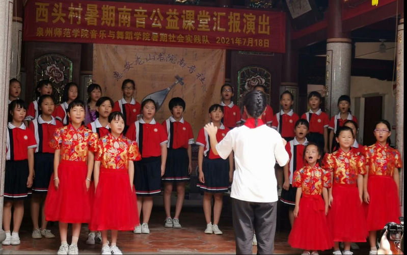 为期一周的音乐与舞蹈学院2021年“传承非遗新生代·南音推广小先锋”暑期社会实践活动暑期实践活动在圆满的汇报演出中落下了帷幕,在这段难忘的时光里,队员与学员们相互学习、相互磨合,收获了经验、收获了友谊,小学员们从最初对南音的一知半解到渐入佳境,再到在汇报演出中的从容和自信,充分感受到了南音这一中华优秀传统文化的博大精深,也树立了传承、弘扬优秀传统文化的决心。相信今后经过校地共同的深耕细作后,西头村这片南音开展的美好沃土上,定会结出南音传承最美的果实。