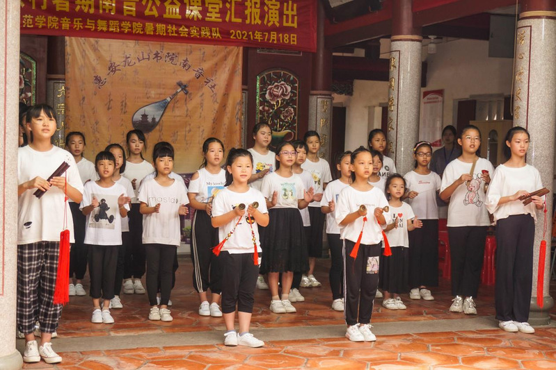 在汇报演出中,来自龙山书院的近50名南音小学员们带来了这6天来的学习成果,南琶齐奏《凤打梨》弹出了对南音的热爱,南音四宝配以童声伴唱的《棉答絮》唱出了对南音工乂谱的传承,《望明月》、《直入花园》、《春光明媚》等经典南音曲目轮番上场,从容优雅、缠绵深沉,回荡在龙山书院。实践队队员演奏的南音四大名谱《梅花操》为汇报演出再添精彩,最后小学员们的一首合唱《少年先锋队队歌》,承载着绵延不断的革命精神,唱出了新一代少年的昂扬精神,振奋着现场的每一位观众。