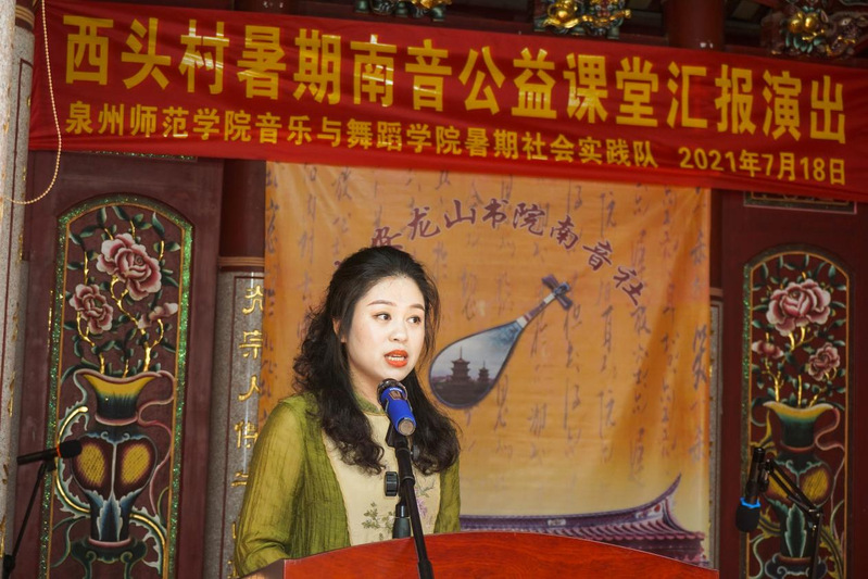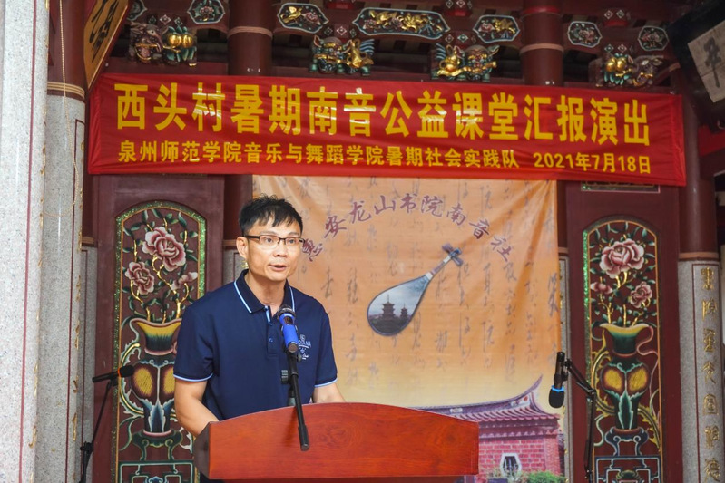 7月18日,实践队指导南音公益班的孩子们一同精心准备了一场南音公益课堂汇报演出,演出开始前由西头村支部书记张钦强与陈恩慧副院长分别致辞,他们共同表达了对本次社会实践活动的肯定与对未来南音协同传承的美好期许。
