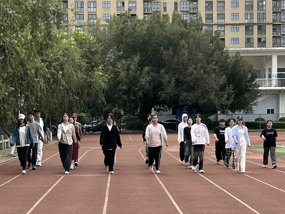 为迎接第41届田径运动会,音乐与舞蹈学院组织学生代表进行了开幕式的方阵训练。
