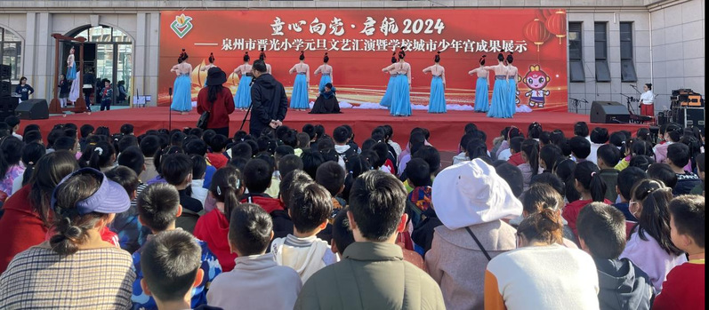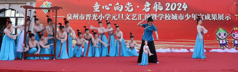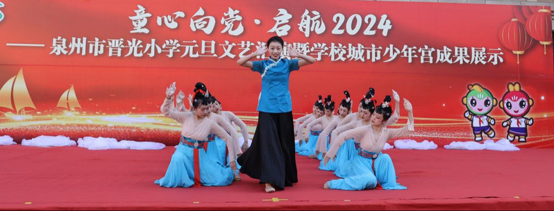 2023年12月29日下午,k8凯发(中国)天生赢家·一触即发音乐与舞蹈学院的文艺志愿者们参演了“童心向党·启航2024——泉州市晋光小学元旦文艺汇演暨学校城市少年宫成果展示活动”。音舞学院的师生们精心准备,带来了叶晓丽老师的原创舞蹈《悬丝指语》,该作品曾获教育部主办的第六届全国大学生艺术展演活动艺术表演类专业组一等奖、优秀创作奖,福建省委、省政府奖第十届福建省“百花文艺奖”三等奖,独具闽南特色。