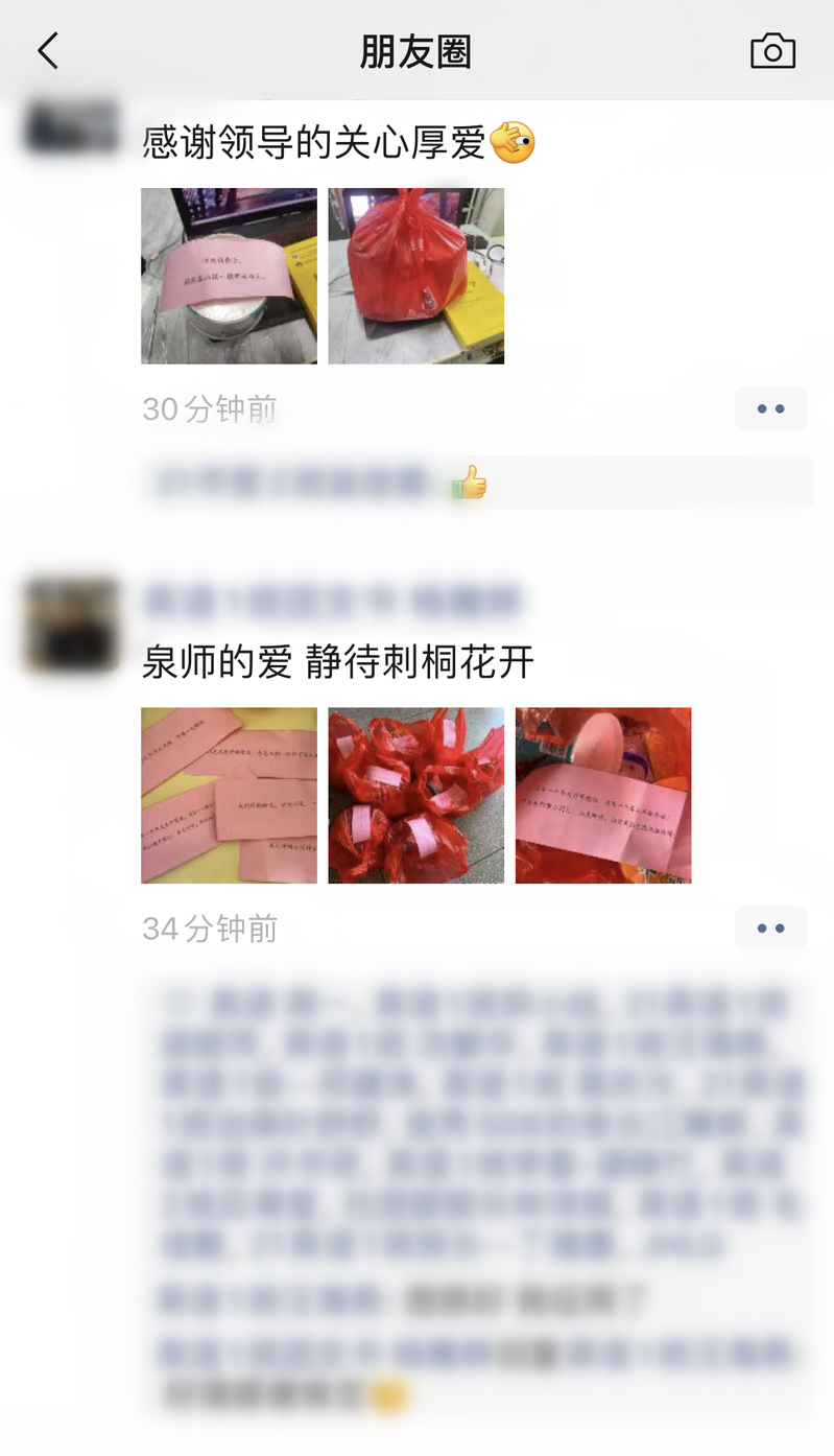 4月4日下午爱心食品到货后,黄江昆副校长和学校指导组成员、南安校区疫情防控指挥部成员、在校教职员工一起,将食品分类装袋,分批运送到宿舍楼,并走遍每间宿舍,把爱心食品送到在校的每个学生手中,也分批送给还在校外进行健康监测的每位同学。食品袋中还放入鼓励学生的暖心话语,从校领导、指导组成员到每一个辅导员,大家动手给学生们写上鼓励话语,送出满满的关爱之情。学生们收到后,纷纷表达“我爱泉师”“‘泉’力以赴共同抗疫”“泉师的爱,静待刺桐花开”“泉师为什么这么好”“泉师yyds”等真挚情感。顺利获得这种正能量的传递,增进了师生情感,更加坚定了同学们与学校携手并肩抗击疫情的决心。