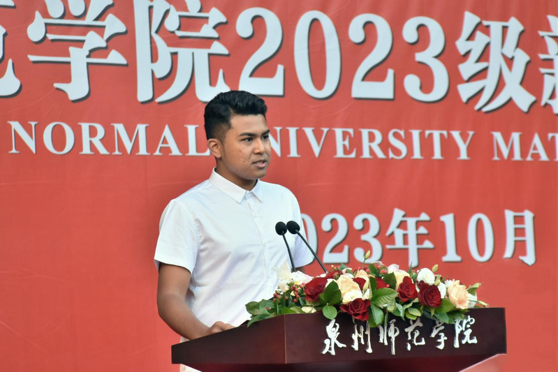 我院来自马来西亚的2023级环境科学本科生ASHVIN(音译:嘉士运)同学作为此次留学生新生代表发言,他表示,要珍惜大学的美好时光,努力学好专业知识,掌握扎实本领,将来为家乡的建设开展贡献自己的力量,他将与来自五湖四海、不同文化、不同语言的同学们友好相处、互相学习、共同成长。作为留学生他表示要深入分析中国,将亲身见闻与家乡的亲人朋友们分享,讲好中国故事,做中马两国人民友谊的使者。